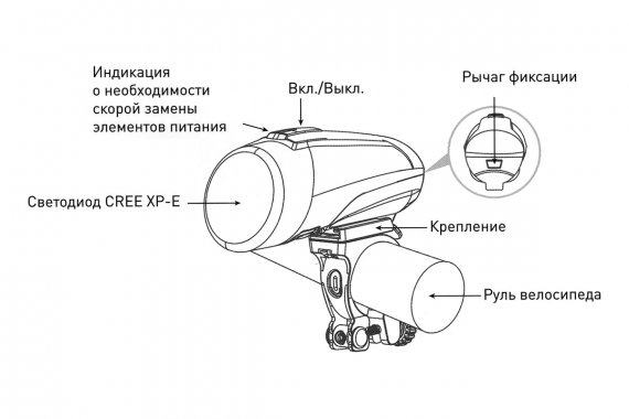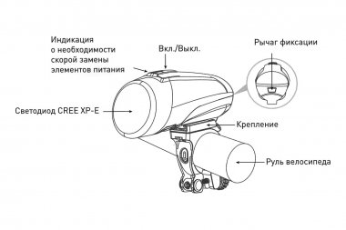 Высококачественная велосипедная фара отвечает требованиям Стандарта безопасности дорожного движения Германии. Имеет 2 режима яркости (100%, 50%) и мигающий режим. 3Вт светодиод CREE XPE (120 люмен).Работает от 4-х элементов питания типа AA.