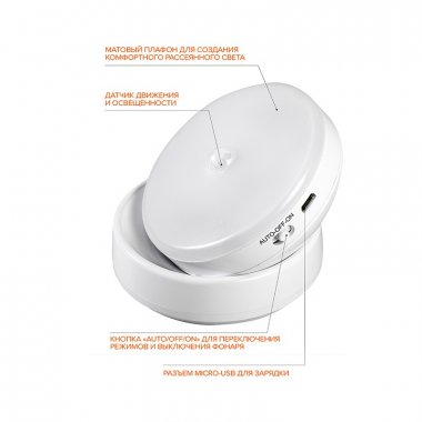 При появлении движущегося объекта в зоне «видимости» датчика движения, происходит автоматическое включение фонаря. Вторым обязательным условием включения является недостаточный уровень освещенности в помещении (определяется датчиком освещенности). Дистанция срабатывания датчика: до 5 метров.