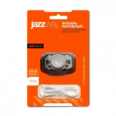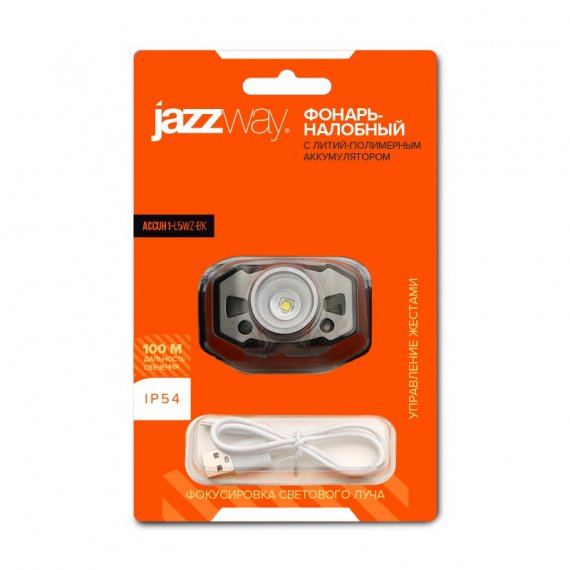Фонарь JAZZway AccuH1-L5WZ-bk Черно-серый относится к категории налобных фонарей. Он имеет регулируемый угол наклона головной части, что позволяет настроить освещение под нужды пользователя. Включение и выключение фонаря осуществляется жестами руки, что очень удобно во время использования. Линза фонаря может быть сфокусирована для увеличения дальности луча до 100 метров. Для зарядки устройства используется USB-кабель, который идет в комплекте. Внутри фонаря установлен встроенный литий-полимерный аккумулятор, обеспечивающий длительное время работы.