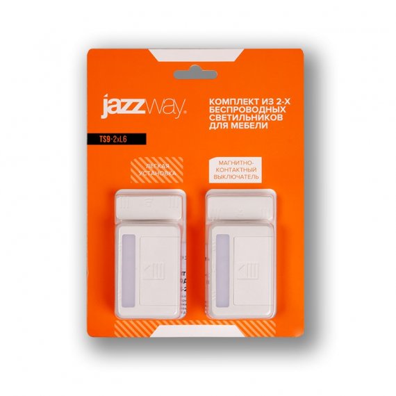 Беспроводные мебельные светильники JAZZway TS9-2xL6 идеально подходят для дополнительной подсветки в шкафах, столах, комодах и гардеробных. Они обеспечивают удобство и простоту установки благодаря использованию двухсторонней ленты-липучки. Работают от 2-х батареек типа ААА.Комплект из 2-х беспроводных мебельных светильников TS9-2xL6 предназначены для использования дополнительной подсветки в шкафах, столах, комодах, гардеробных. Теперь вам не придется заниматься прокладкой проводов, и вы сможете легко и быстро установить светильник при помощи двухсторонней ленты-липучки, которая входит в комплект поставки. Работают от 2-х батареек типа ААА. Благодаря магнитно-контактному выключателю светильник будет загораться при открывании дверцы шкафа, а при закрытии гаснуть.