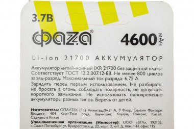 Представляем вашему вниманию литий-ионный аккумулятор ФАZА 21700 4600мАч BL-1. Этот аккумулятор отличается отсутствием платы защиты, что делает его идеальным выбором для устройств с контроллером заряда-разряда. Емкость аккумулятора составляет 4600 мАч.Литий-ионный (Li-ION) аккумулятор типоразмера 21700 без платы защиты.. Предназначены для использования в устройствах с контроллером заряда-разряда (схемой защиты). Входное напряжение заряда 4,2 – 4,25 В. Стандартный ток заряда: 900 мАч. Максимальный ток заряда: 2250 мА. Стандартный ток разряда: 900 мА. Максимальный ток разряда: 6800 мА. Температура заряда: 10 – 45 градусов. Температура разряда: -20 – 60 градусов. Температура хранения: 10 – 40 градусов