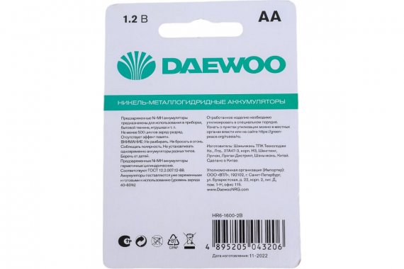 Технические характеристики DAEWOO AA (1600mAh) Ni-MH BL-2 5043206