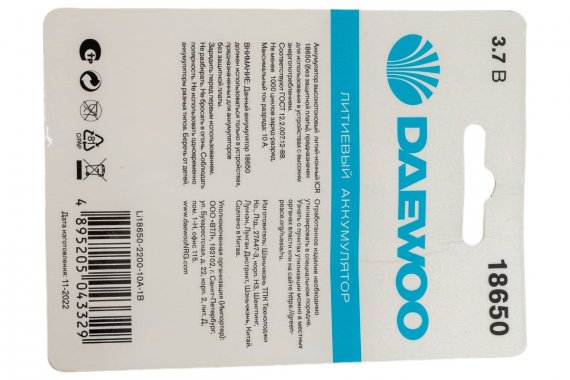 Технические характеристики DAEWOO 18650 2200мАч 10А BL-1 Li-Ion 5043329