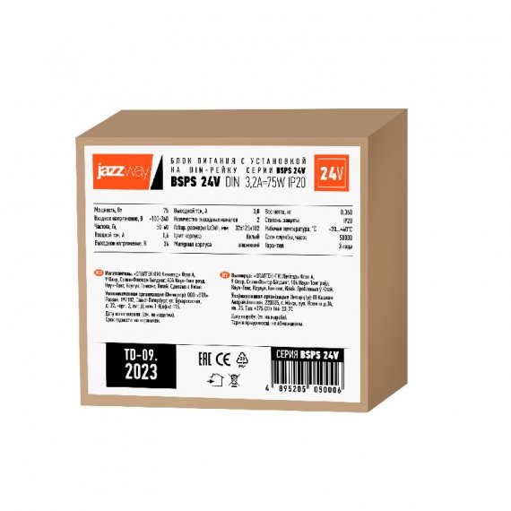 Артикул: BSPS DIN 24V 3.2A= 75w IP20 AL 3г.гар Jazzway